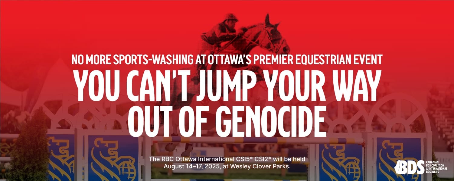 "You Can’t Jump Your Way Out of Genocide: No More Sports-Washing at Ottawa’s Premier Equestrian Event," read the campaign headline on letter-writing website ActionNetwork.org.