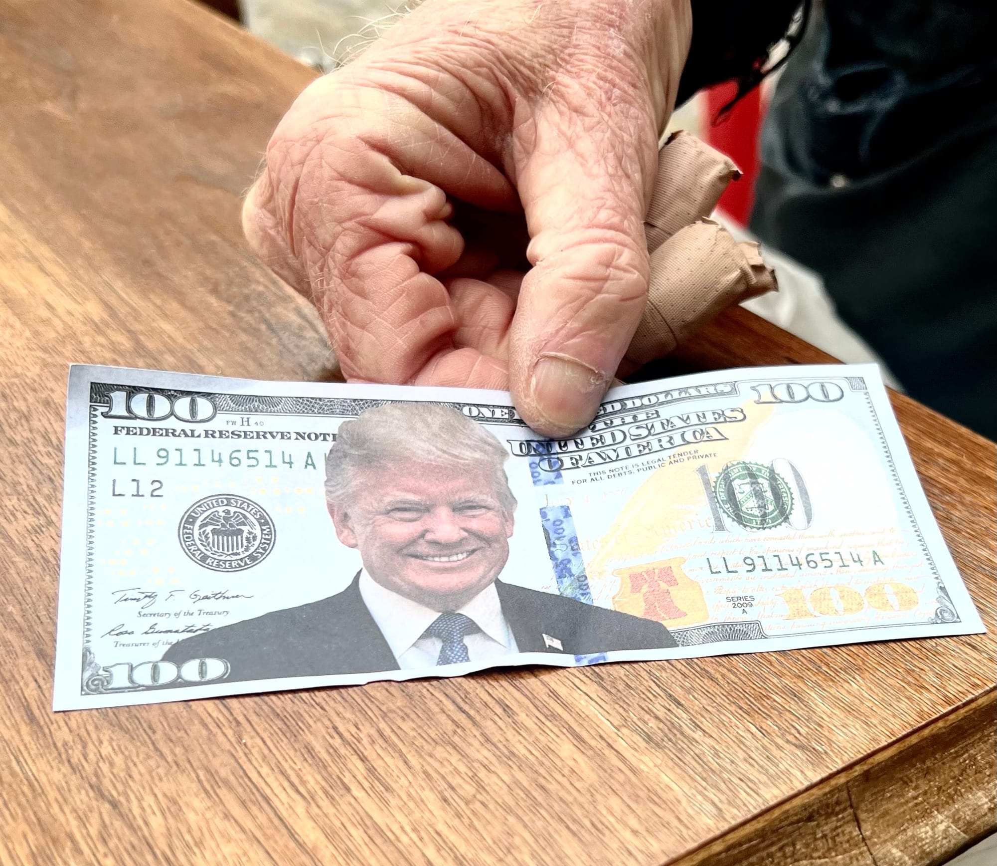He looked closer, turned the bill over and instead of your great president Benjamin Franklin (whose words I have tattooed on my arm) it had Donald Trump’s face on it with a smarmy grin. It was a fake. So a wealthy turd thought it would be funny to punk a street performer?