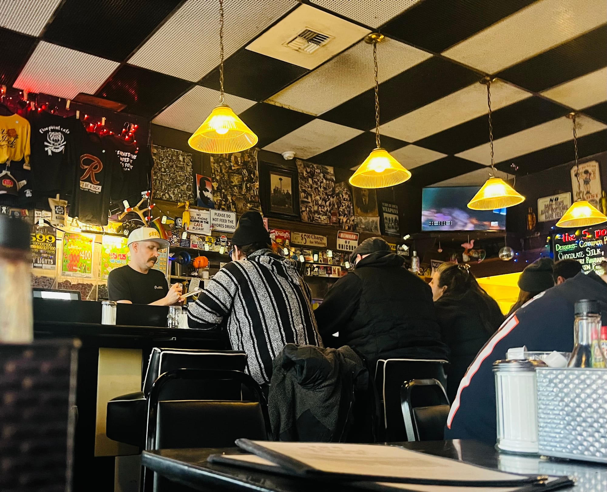 Later we went out to dinner, then to the Moore. After that we went to the Black Cat Bar, described to us as a dive bar by a hipster at the hotel. To my mind it was more like a hipster bar, but I guess a hipster bar to a hipster is a dive bar because a dive bar is hip. There were great pinball machines, bad mixed drinks, and good music played loudly: Metallica, Tupac, Beastie Boys. We almost had to remind ourselves we were in the U.S. not East Vancouver.