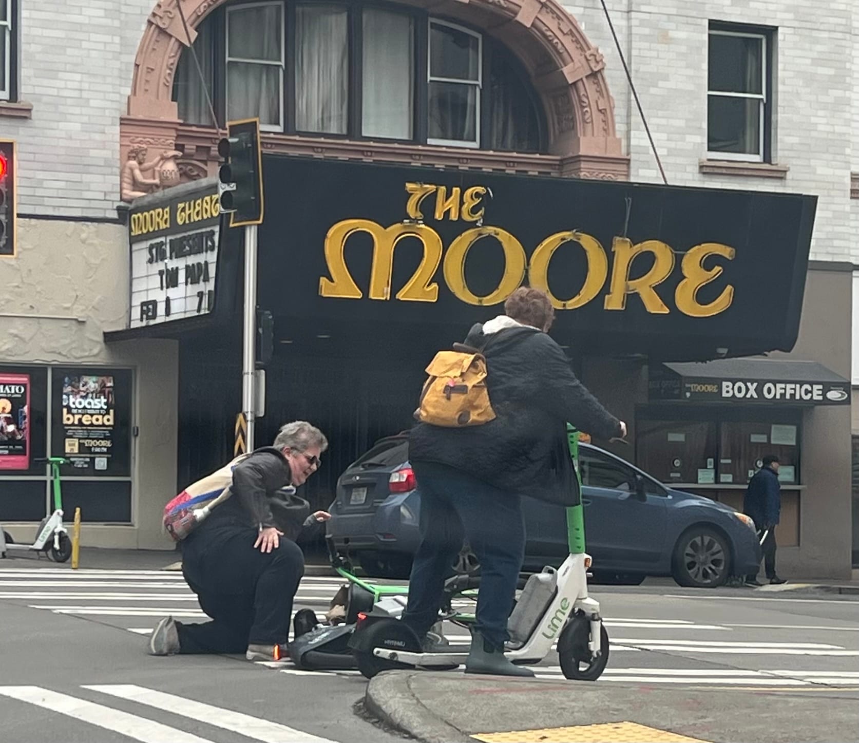 Then I saw two larger female tourists stopped at the corner across from The Moore on rented e-bikes. I and other drivers watched in horror as one of them fell over in slow motion at the curb. I laughed and others did too, but only when we saw that she was OK and both women were laughing themselves.