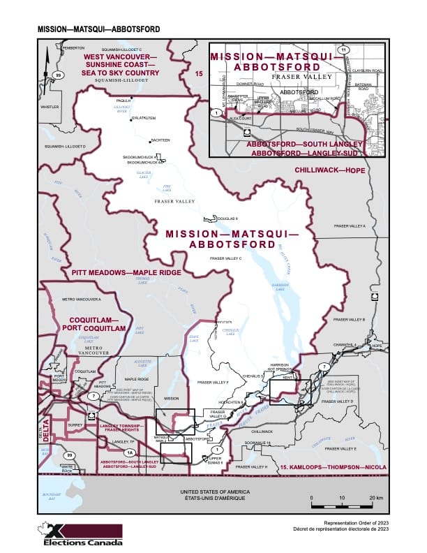 Chilliwack-Hope was first created in 2012 with the federal electoral boundaries redistribution, and was first contested in 2015. That incarnation of the riding that includes Chilliwack made it its smallest size ever, created out of 76 per cent of the electoral district of the former Chilliwack-Fraser Canyon, which went all the way from the Vedder Canal up to Cache Creek. That Fraser Canyon and north moved in 2012 to the Mission-Matsqui riding. Now with the 2022 adjustments, the Canyon is back with Chilliwack and Hope, along with the rural areas in between and some stretches north and east.