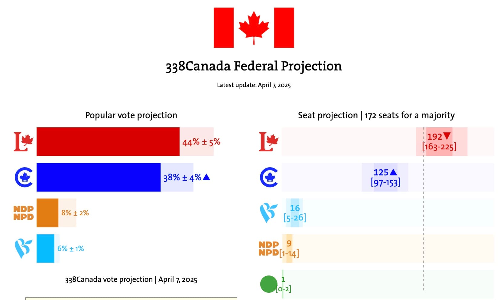 However, on April 7, 2025, the polling aggregator shows a six-seat drop for the Liberals projected from 198 as of April 4 down to 192, with the Conservatives picking up four and the NDP two. A majority government is formed in the 343-seat Parliament with 172 seats.
