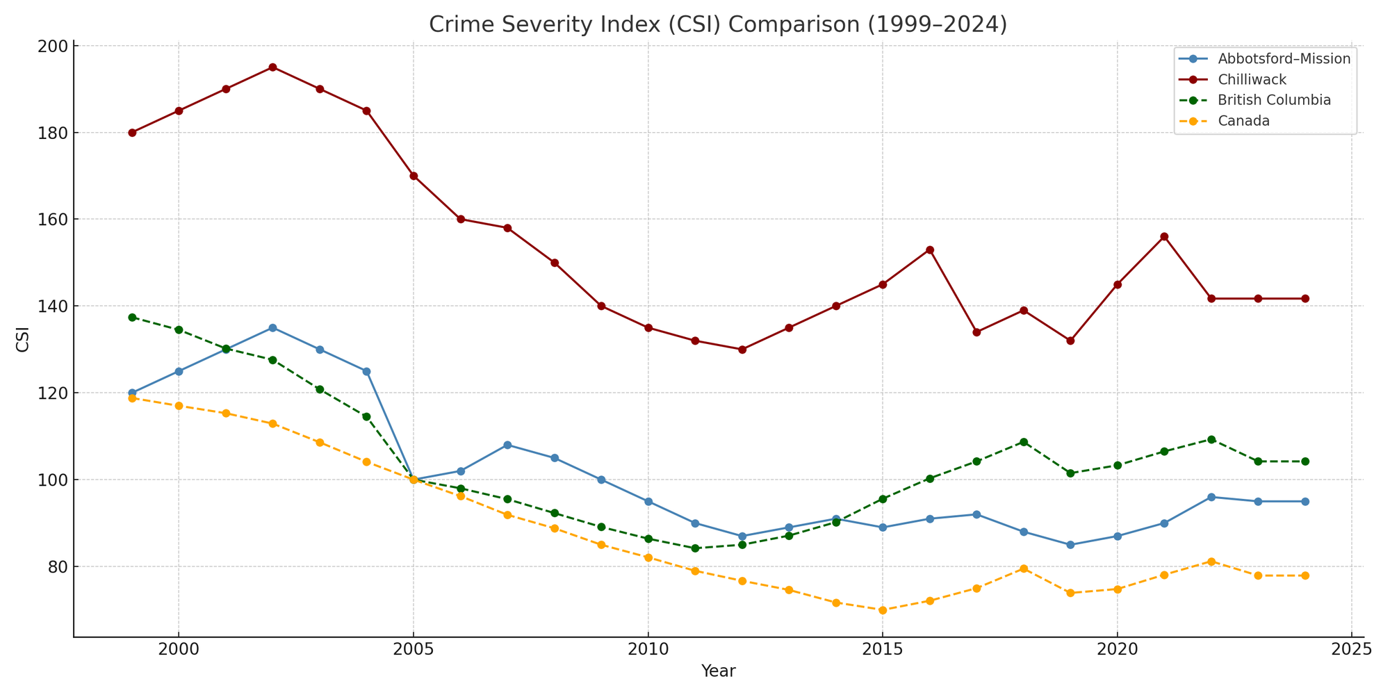If you want to drill into it, the biggest three-year drop in Chilliwack’s CSI was while Paul Martin was prime minister, a Liberal, when it went from more than 190 to below 160. Then while Conservative Stephen Harper was prime minister, 2006 to 2015, the CSI in Chilliwack it dropped to about 130 in the middle of his term but then shot back up to 145 by the last year. The graph is shaped like a deflated letter ‘U.’ Between 2015 and 2024, while Trudeau’s Liberals have been in power the Chilliwack CSI is unchanged.