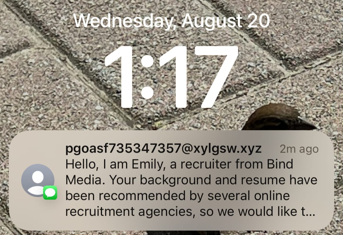 Literally as I was typing the above sentence, my phone dinged with the second one I received today, a text from "Emily." Here's a screenshot: