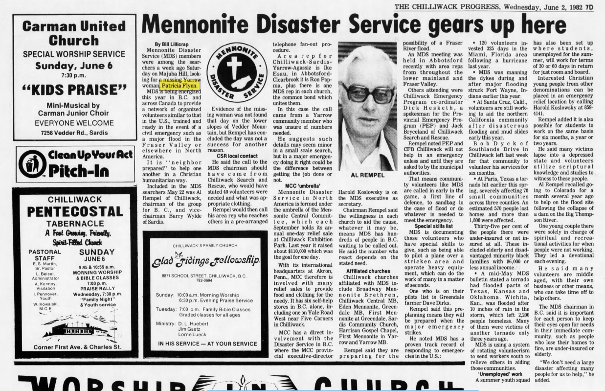MDS searchers took part in a search for Flynn two months later on May 22, 1982. That search included Al Rempel of Chilliwack who was chairman of the group for B.C., and vice-chairman Barry Wylde of Sardis.