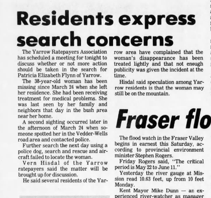 An immediate search of the area was initiated and continued for several days with no success in March 1982. The April 1982 news story said Flynn had been spotted in the Vedder Road/Wells Road area on the day she went missing.