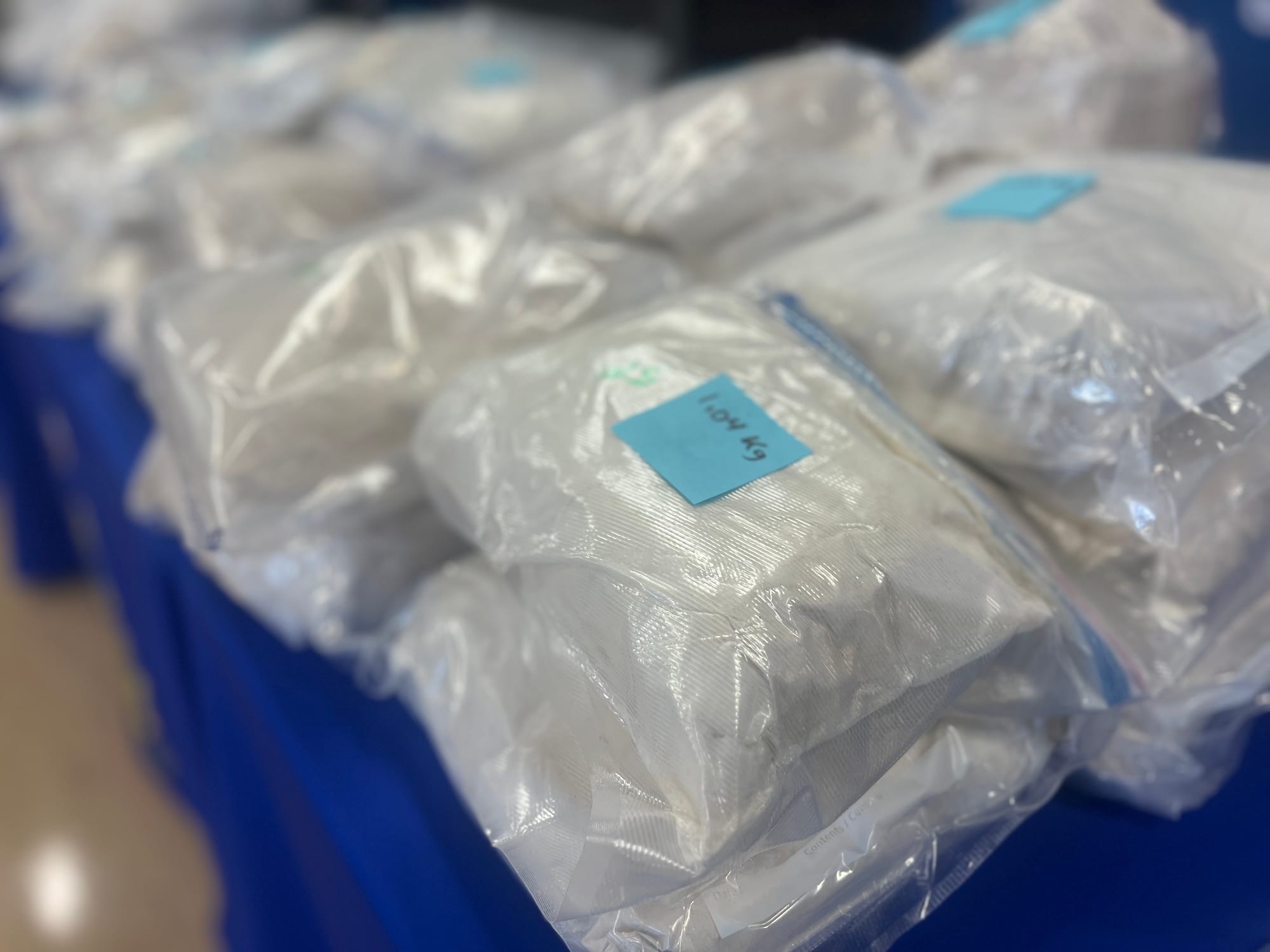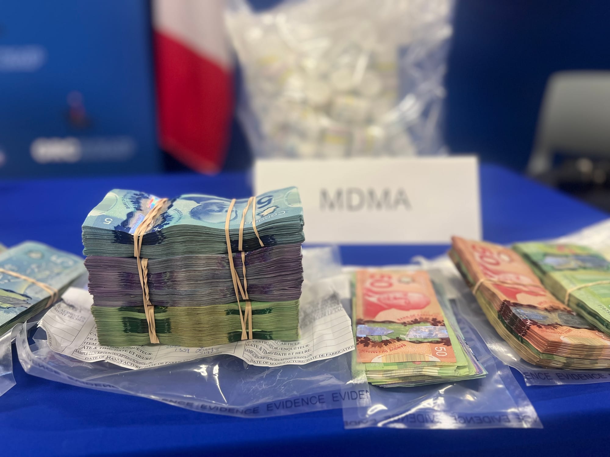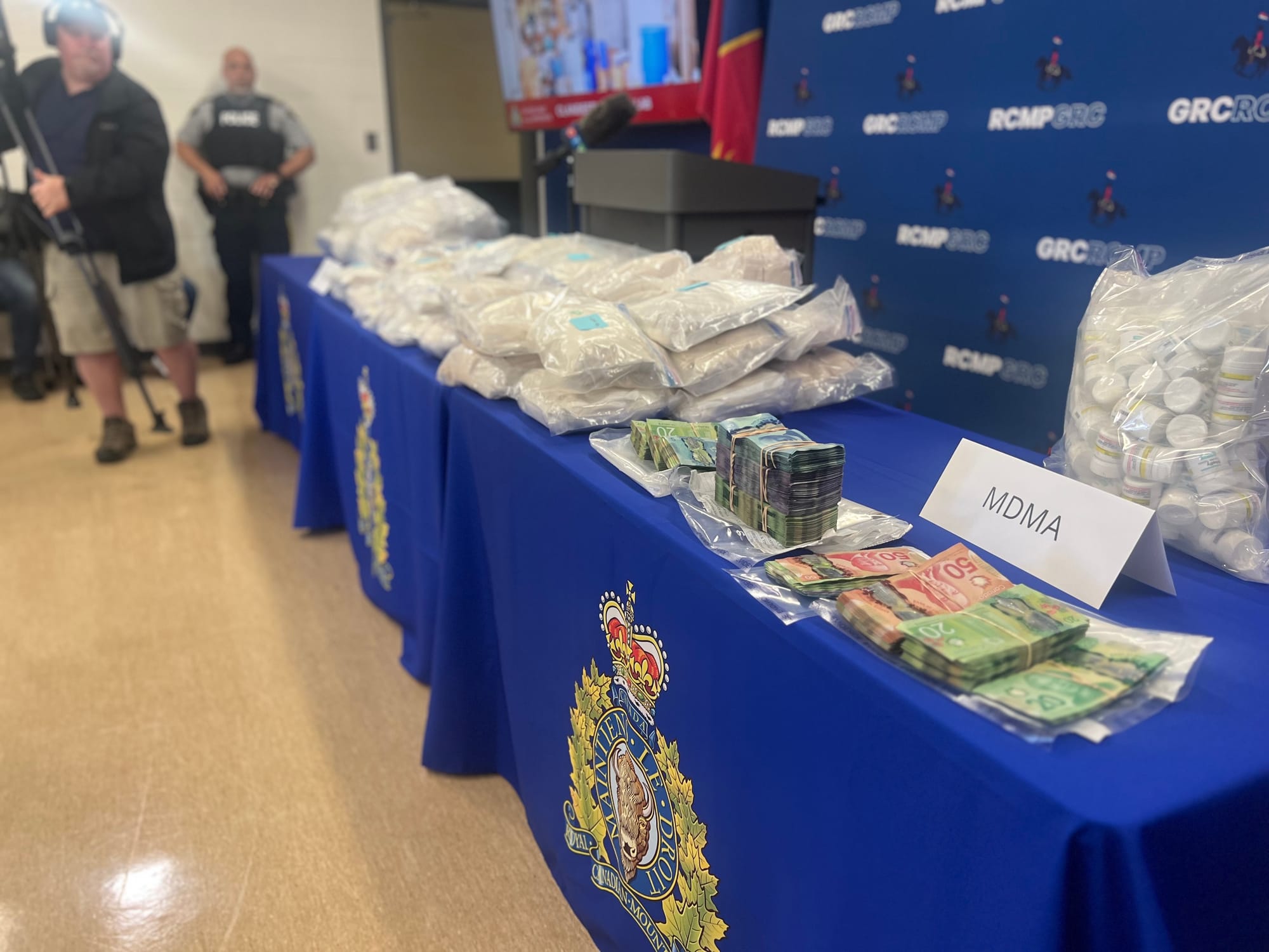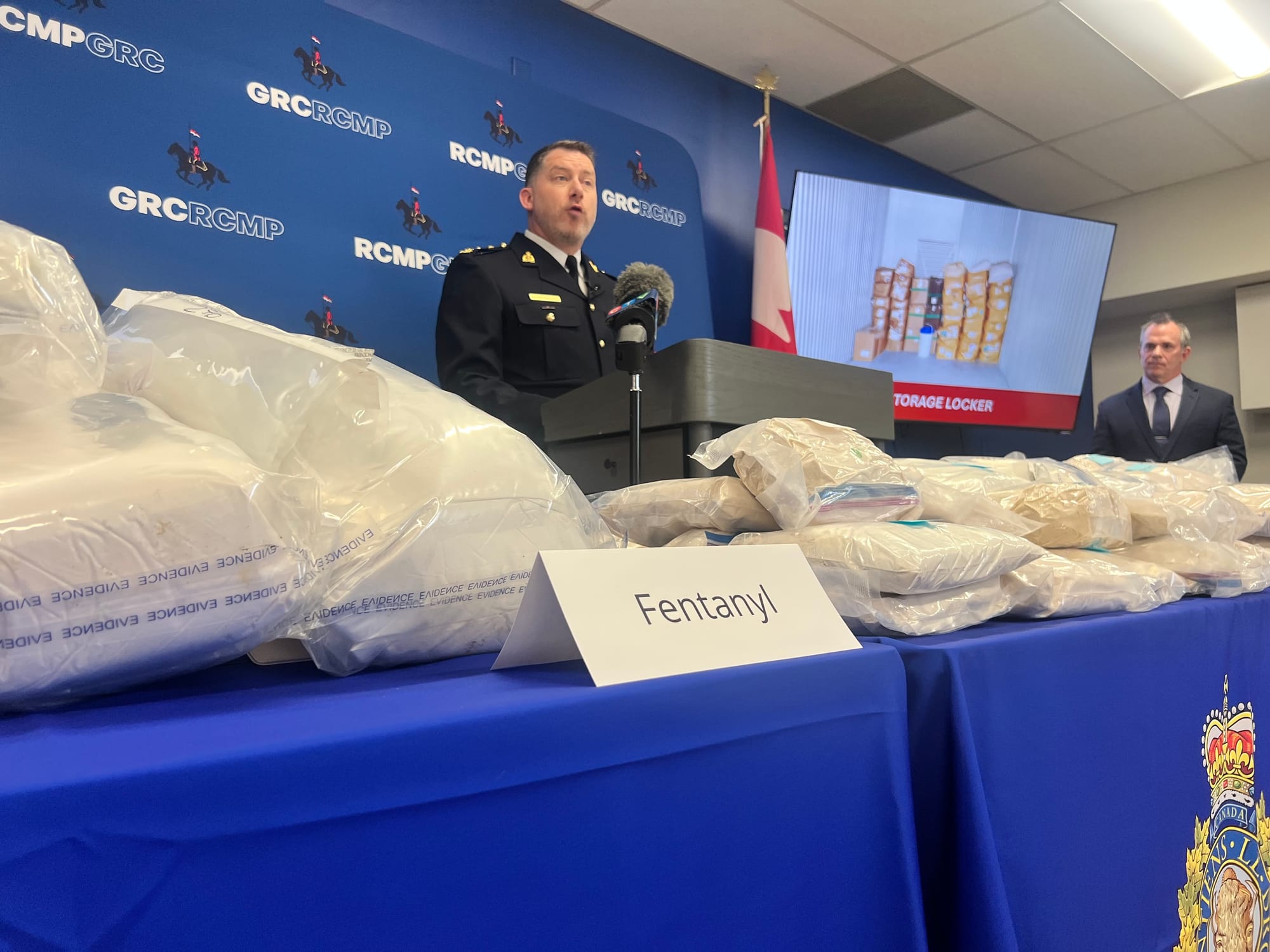 Members of the media were invited to the Airport Road detachment for an epic show-and-tell with mountains of bags of powdered fentanyl and stacks of Canadian currency lay across two large folding tables in front of a podium and two TV screens showing off photographs from inside the lab and a shipping container.