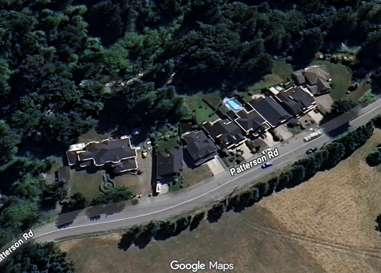 Eight properties (first three images) on Patterson Road in Chilliwack that are under evacuation alerts on Dec. 11, 2025 because of flooding due to heavy rains, the area in the Chilliwack River Valley under evacuation alerts and orders, and one property on Wilson Road in the Chilliwack River Valley under an evacuation order.(Google Maps)