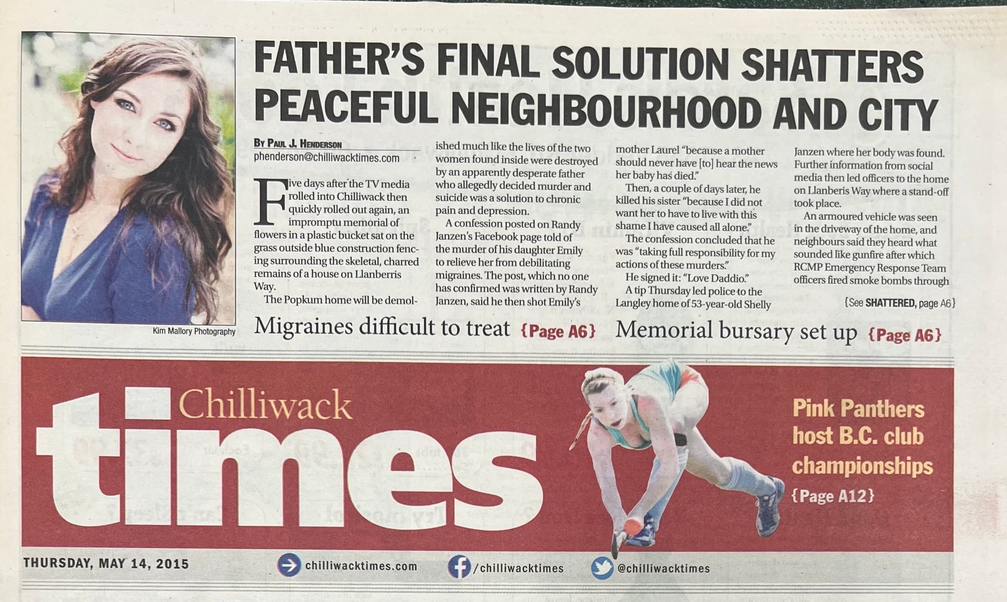 (This story appeared in the May 14, 2015 edition of The Chilliwack Times following the triple murder and suicide that rocked the community and made national and international news. I remember vividly standing in the middle of Llanberris Way as an IHIT spokesperson held a news conference, the burned out shell of the family home in the background - PJH Feb. 6, 2025)