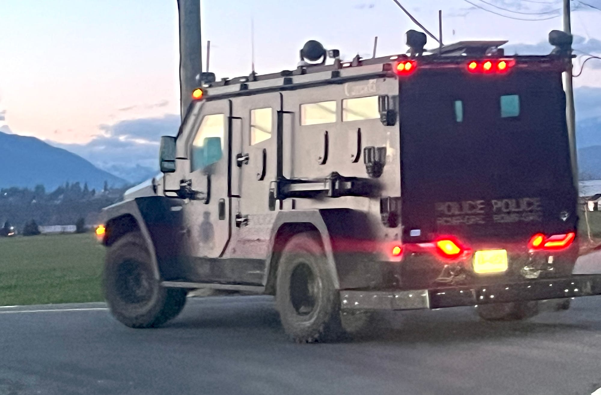 There was at least 10 RCMP vehicles, including half a dozen pickup trucks used by the Lower Mainland Emergency Response Team, two ambulances, and a Lenco BearCat G3, the heavily-armoured tactical vehicle used by police in high-risk operations.