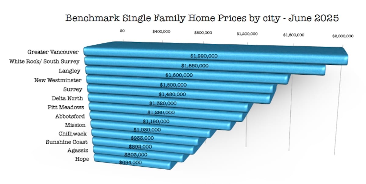 "Although home sales were only just above levels from the same month last year, June marked a departure from the declining monthly trend that began in early 2025,” according to Chilliwack and District Real Estate Board (CADREB**) president Emily Vernon, adding: “Right now, it’s too early to tell if this is the beginning of momentum that will get us back on track to more solid activity or just a one-off.”