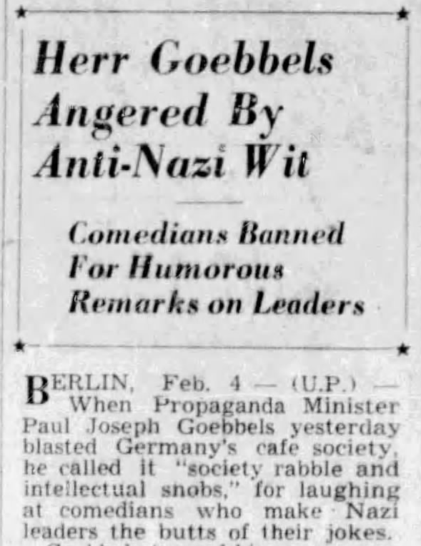 This story is outlined in a Feb. 4, 1939, United Press article under the headline: “Herr Goebbels Angered By Anti-Nazi Wit.”