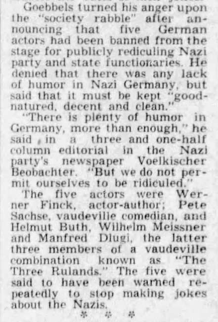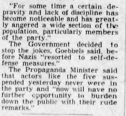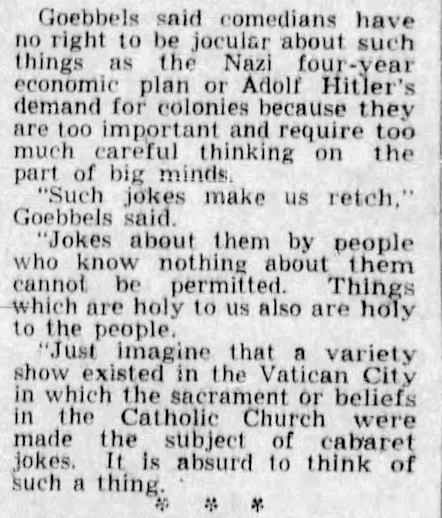 “There is plenty of humor in Germany, more than enough,” he said, in an editorial in the Nazi party's newspaper Voelkischer Beobachter. “But we do not permit ourselves to be ridiculed.”