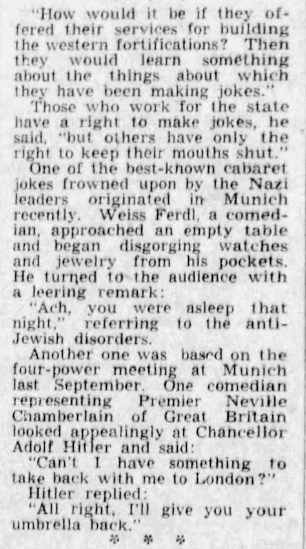 Another knee-slapper referenced the Munich Agreement reached between the leaders of Germany, Italy, France and the U.K., on Sept. 30, 1938. In the joke, a comedian representing Prime Minister Neville Chamberlain of Great Britain looked longingly at another portraying Adolf Hitler and said: “Can’t I have something to take back with me to London?”