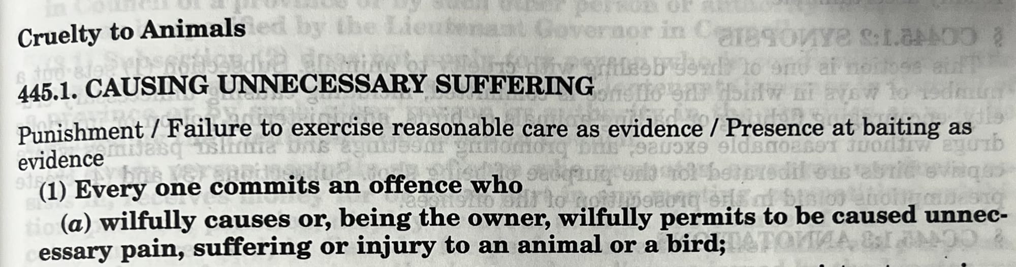 The most common charges for animal cruelty come under the Protection of Cruelty to Animals Act (PCAA), but criminal charges are also possible. Under the cruelty to animal section of the criminal code, Section 445.1(1)(a) addresses causing unnecessary suffering, specifically, an offence is committed by anyone who “wilfully causes or, being the owner, wilfully permits to be caused unnecessary pain, suffering or injury to an animal or bird.”