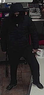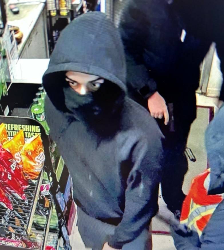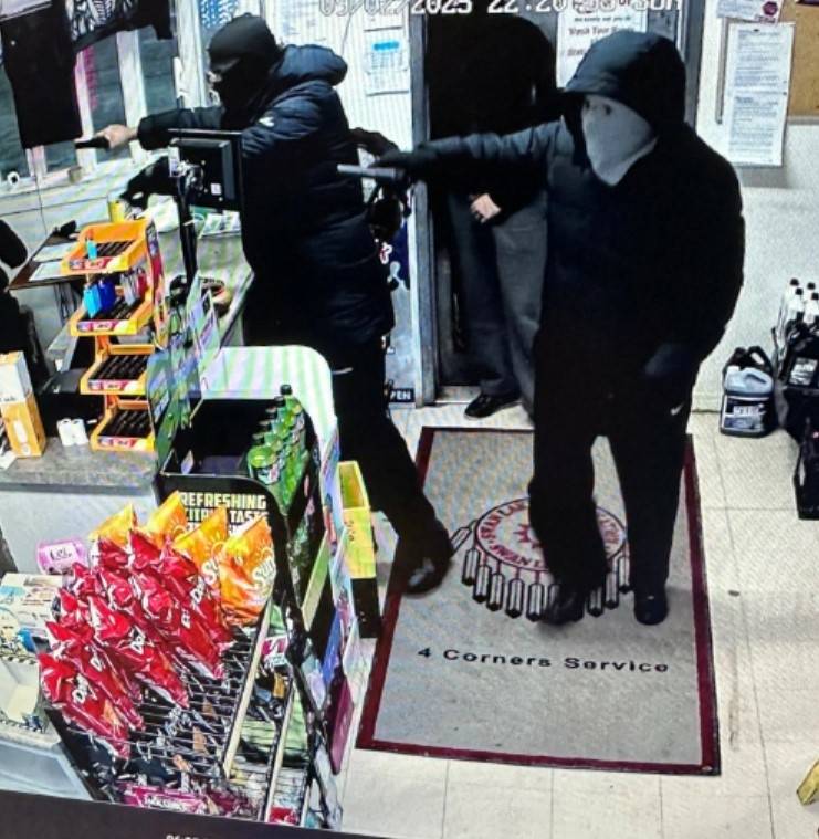 Security images from an armed robbery on Swan Lake First Nation near Winnipeg in February 2025. Four men are charged in a series of robberies, including this one, three of whom are also charged with the kidnapping and first-degree murder of a 19-year-old man in Abbotsford in January 2025. (Manitoba RCMP handout)